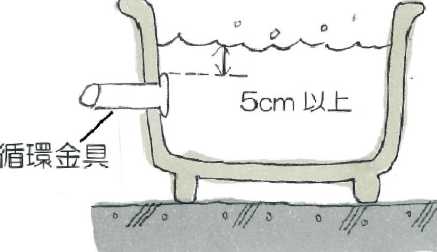 「①凍結予防ヒーター」と、機器本体と浴槽間の配管を水で満たし凍結